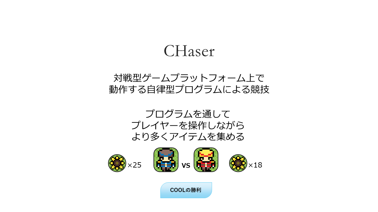 CHaserは、対戦型ゲームプラットフォーム上で動作する自律型プログラムによる競技です。 プレイヤーはプログラムを作成し、アイテムを集めたり、相手をブロックで囲んだりして勝利を目指します。